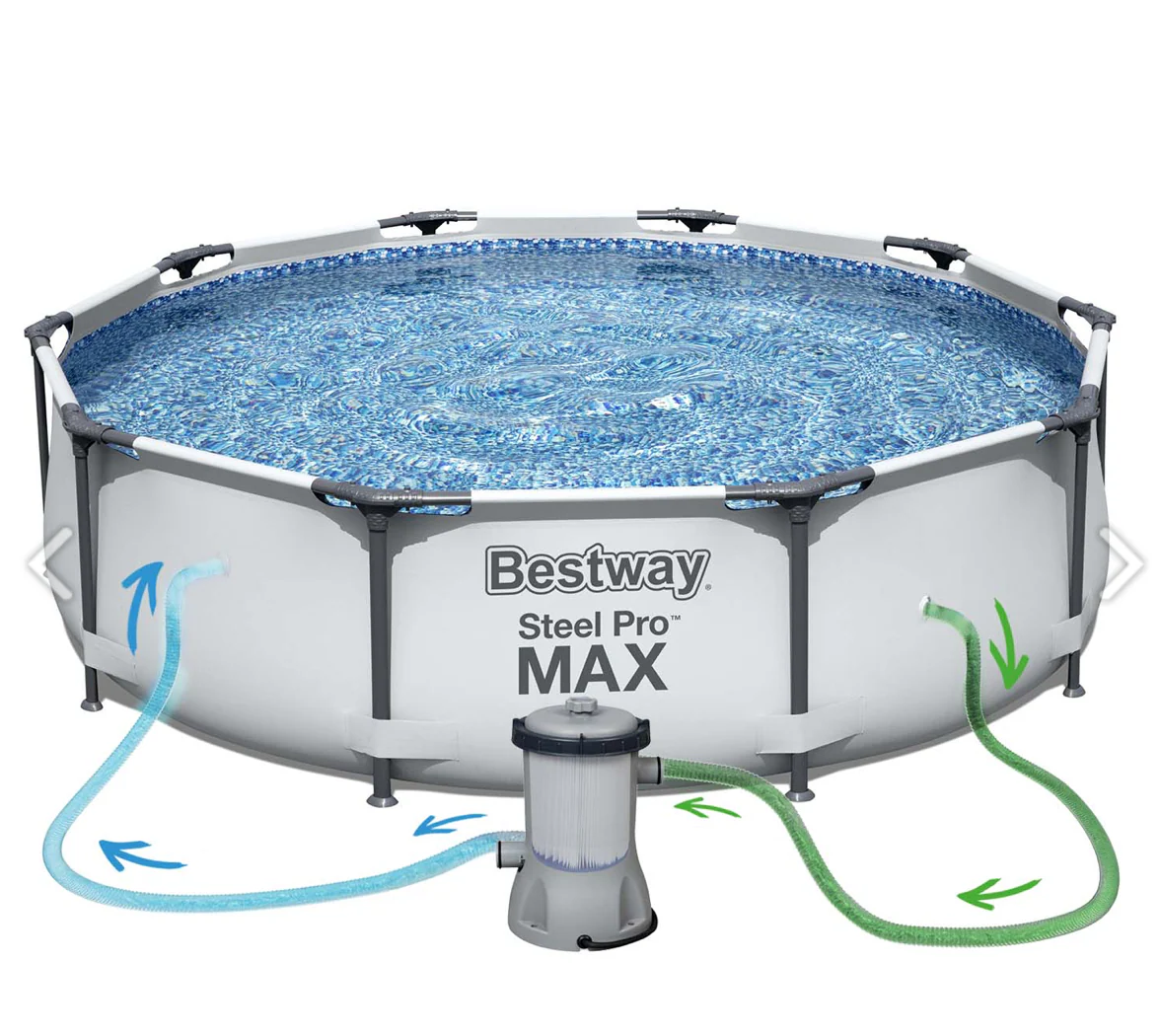 - * The Bestway 12ft Steel Pro Max Pool comes as a complete set; featuring framed swimming pool, 330gal filter pump, filter, 2 attachable cup holders and a repair patch